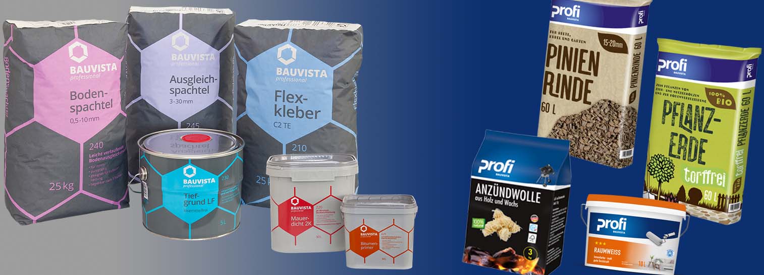 Als Ihre Einkaufskooperation im Baustoff-Fach- und Einzelhandel, verfügen wir über zwei Eigenmarken, um beide Branchen abdecken zu können: BAUVISTA profi und BAUVISTA professional. Dabei achten wir auf eine gute Qualität zu günstigen Konditionen. Unsere Eigenmarke erstreckt sich über verschiedene Sortimente von Farben über Erden und Dünger, bis hin zu Mörtelprodukten. Schauen Sie rein und überzeugen Sie sich selbst!